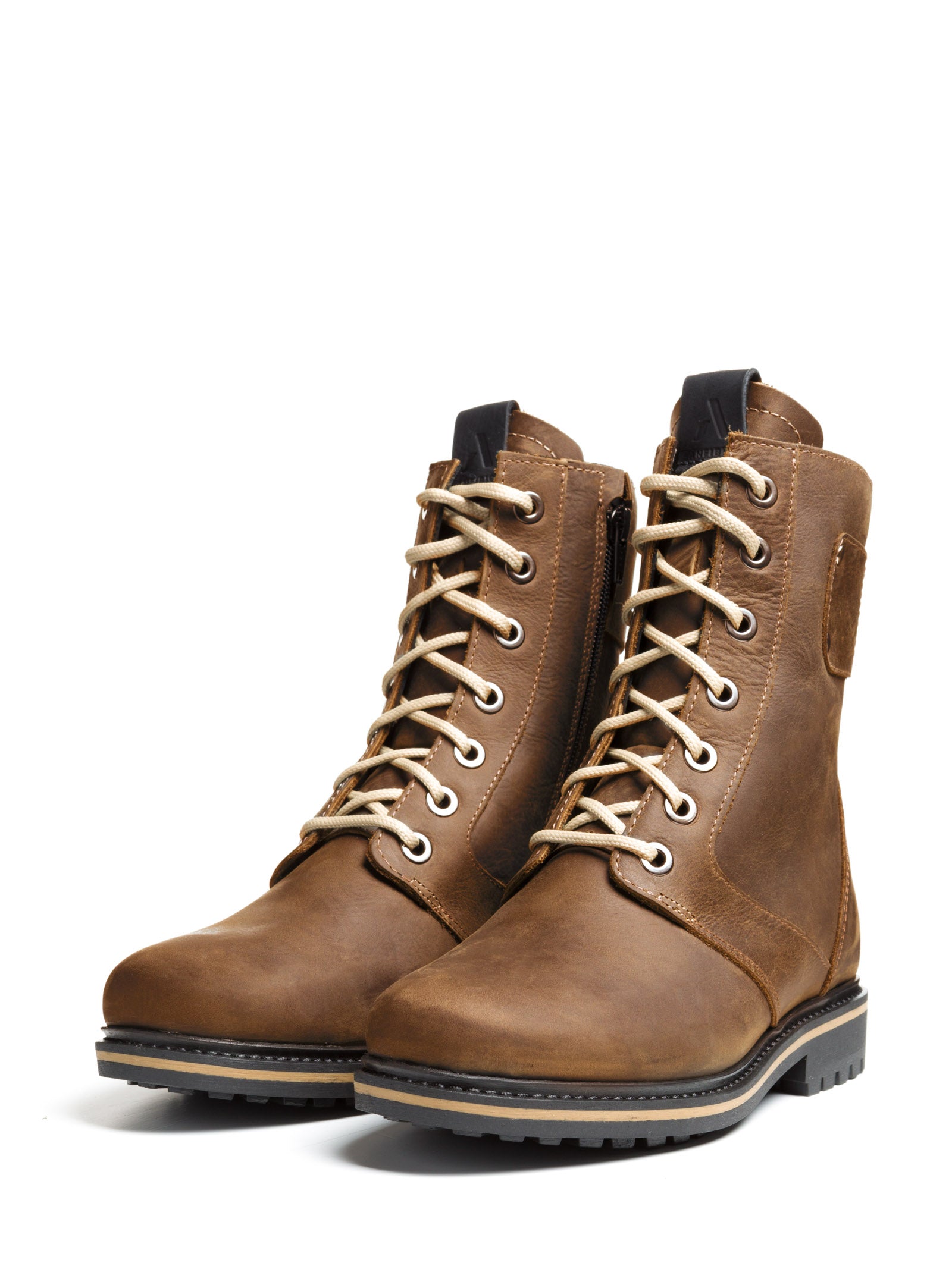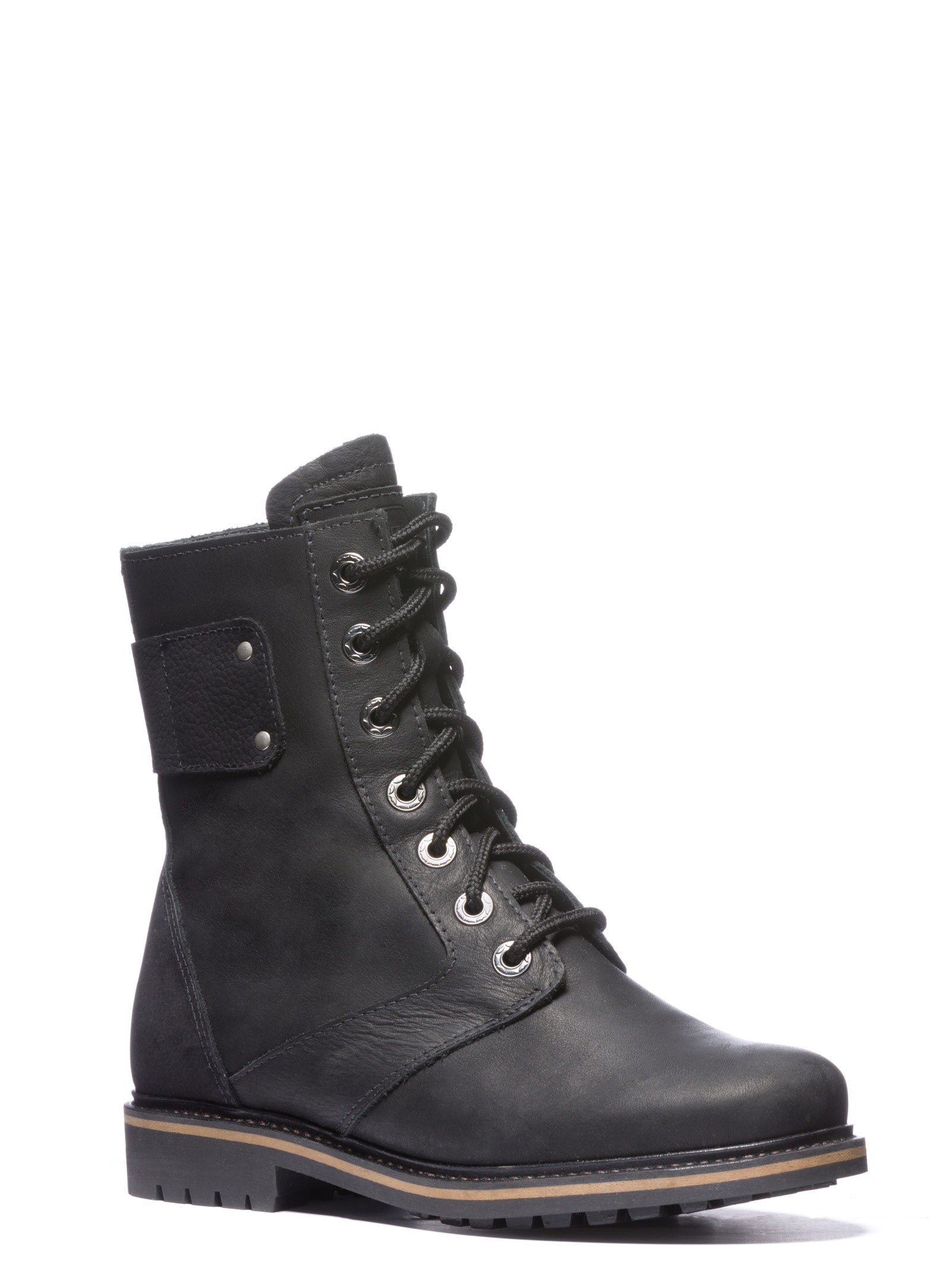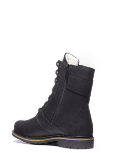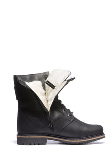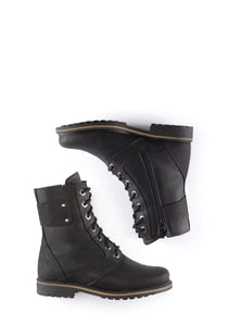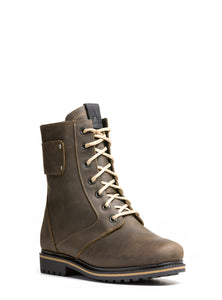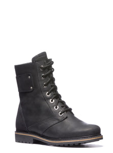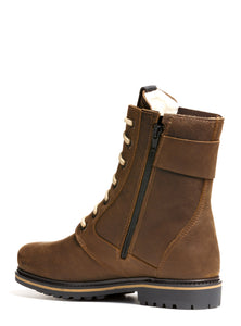 The KANDA boot balances rugged winter performance with refined femininity. Handcrafted in waterproof full-grain leather, its tall lace-up silhouette is reinforced with hiking-inspired hooks and discreet metal eyelets for durability. A tonal strap detail adds subtle structure, while a hidden interior zipper ensures effortless wear.